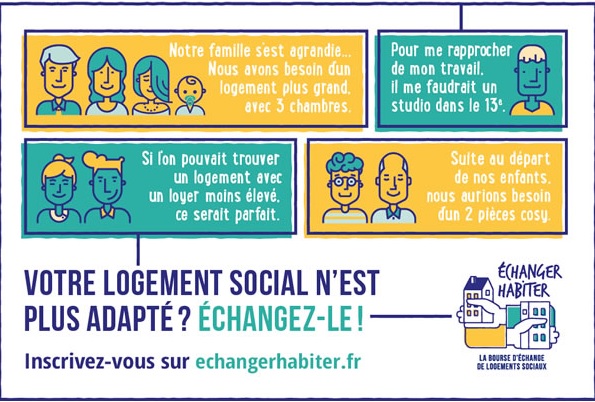 Votre logement social ne convient plus à vos besoins ? Vous pouvez l’échanger avec un autre locataire. Plus de 4 300 locataires ont déjà échangé leur logement grâce à la bourse d’échange. Rendez-vous sur le site www.echangerhabiter.fr pour consulter la liste des bailleurs participants.