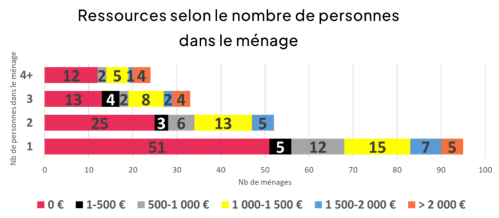 En ce qui concerne les ressources, 84% des ménages (sur 204 pour lesquels nous possédons l’information) sont en dessous du seuil de pauvreté, c’est-à-dire moins de 60% du revenu médian.