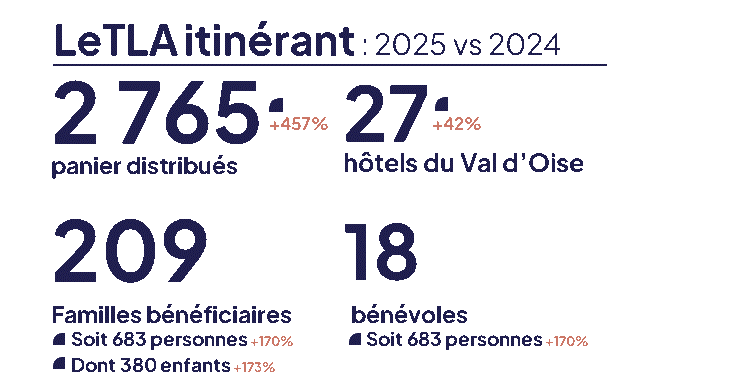 Le Tiers-Lieu Alimentaire itinérant constitue aujourd’hui un levier essentiel pour toucher des publics souvent éloignés des dispositifs classiques. Pensé comme un dispositif d’aller-vers, il permet d’intervenir directement dans les hôtels du Val-d’Oise afin de distribuer des paniers alimentaires aux familles orientées par le 115.